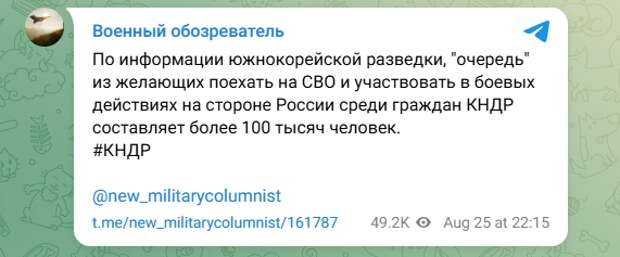 И вот при всем этом южнокорейская разведка на днях поделилась данными о том, что в КНДР сформировались настоящие очереди из тех, кто хочет отправиться на СВО.
