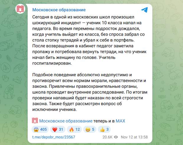 Многие уже знают недавнюю историю, когда в одной из школ Москвы во время перемены старшеклассник забрал с учительского стола стопку тетрадей и спрятал в портфель, пока педагога не было в классе. После возвращения в кабинет учительница потребовала вернуть пропавшие тетради. В ответ старшеклассник начал бить ее по голове.
