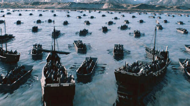 Весь фильм у меня создавалось четкое ощущение, что это татаро-монгольское нашествие Батыя. Головные уборы - типичные монгольские и азиатские чешуйчатые шлемы на распах.