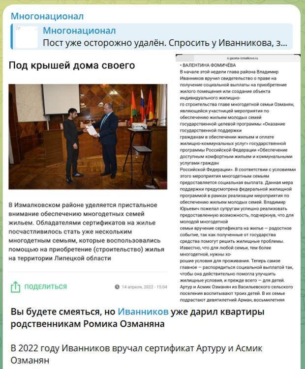 "Похоже, что это самая нуждающаяся семья в Липецкой области (ну или мафия). Судя по тенденции, пока местная администрация не одарит каждого члена малоимущего семейства квартирами, Владимир Иванников не успокоится. Надеемся, что соответствующие органы обратят на это внимание", — написал «Многонационал».