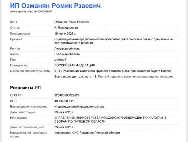 Ну и еще один нюанс. Русский фермер Анатолий Васильевич Лопатин судился с управлением сельского хозяйства Липецкой области, обвиняя в нарушениях при выдаче гранта Озманяну и Нвере Темури Брояну. Лопатин проиграл в областном и Верховном судах России, после чего его КФХ ликвидировали в 2022-м.