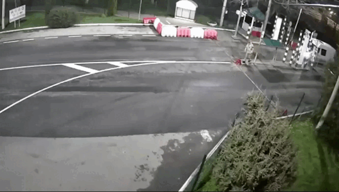 На видео с камеры наблюдения видно сначала пограничника, который ведёт себя буквально как вратарь на воротах: бежит вдоль шлагбаума, расставив руки и готовясь что-то поймать. Через несколько секунд в кадре появляется мчащийся на большой скорости мотоциклист, пограничник повисает на байке и выбивает водителя из сиденья. Байкер вскакивает и бежит к границе, пограничники - следом.