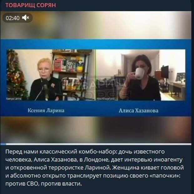 "Перед нами классический комбо-набор: дочь известного человека, Алиса Хазанова, в Лондоне, дает интервью иноагенту и откровенной террористке Лариной. Женщина кивает головой и абсолютно открыто транслирует позицию своего "папочки": против СВО, против власти," - комментирует телеграм-канал ТОВАРИЩ СОРЯН.