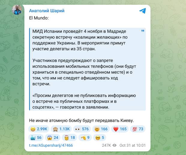 Срочные новости понеслись по европейским СМИ - и то, что должно было быть тайным, стало явным. Оказалось, что в Испании должна пройти секретная встреча союзников Украины. На сей раз европейские ястребы хотели, чтобы их собрание в Мадриде не привлекало лишнего внимания, но вышло ровно наоборот.