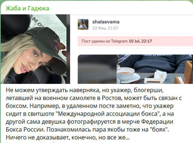 Позже ТГ-канал "Жаба и Гадюка" предположил, что "возлюбленный" Шалаевой может быть связан с боксом.