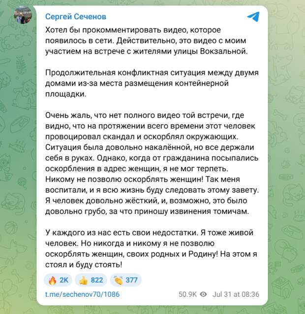 Позже спикер городской Думы объяснил свою горячую реакцию. Сказал, что есть масса свидетелей той встречи, где видно, что на протяжении всего времени его оппонент провоцировал скандал и оскорблял окружающих. Ситуация была довольно накалённая, но все держали себя в руках. Однако, когда от гражданина посыпались оскорбления, Сеченов, бывший командир штурмового отряда "Гром" и начальник штаба парашютно-десантного батальона, не стерпел:
