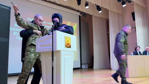 Фронтовика при наградах попытались вывести со сцены сначала люди в штатском, потом некто в одежде защитного цвета.