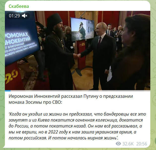 Во время юбилея RT президент России встретился с иеромонахом Иннокентием. Он рассказал Владимиру Путину о пророчестве монаха Зосимы - настоятеля Успенской Николо-Васильевской обители, что в ДНР, которого в народе называли великим старцем. Сказаны они были десятилетие назад.