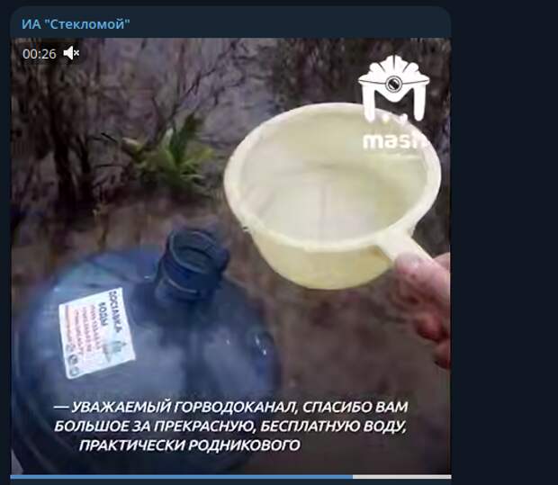 "Посёлок Машзавут. Улица Колонтай. Вот такую водичку мы собрали. Это дождевая вода. Умыли, сделали все свои нужды такой водой".