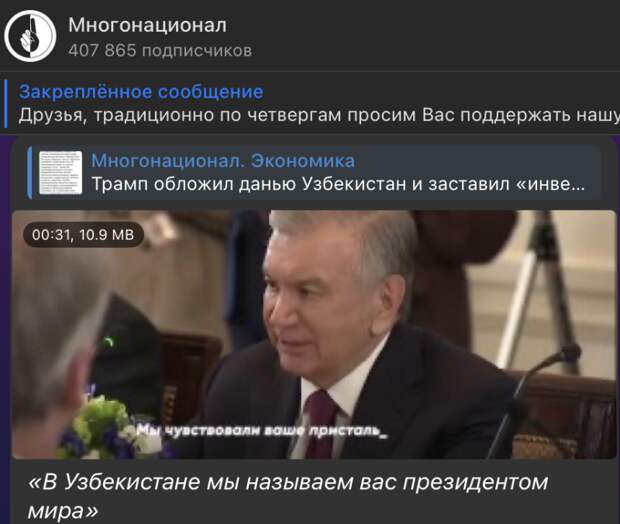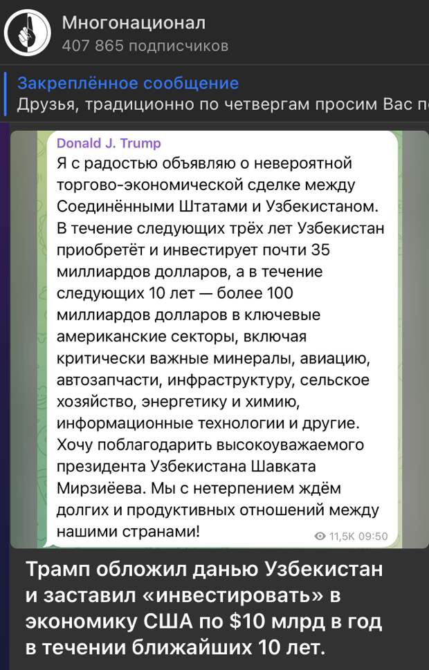 А в это самое время президент Узбекистана Мирзиеёв едет на средне-азиатский саммит к Трампу (5+1), где клянется, по требованию американского президента, вложить в экономику США 35 миллиардов долларов за три года.