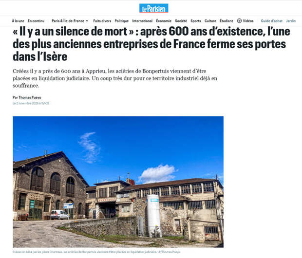 Во французском городке Апприё, к северу от реки Изер, остановилось сердце шестисотлетней промышленной легенды - сталелитейного завода Bonpertuis. Предприятие, пережившее войны, революции, кризисы и смену эпох, окончательно закрыто решением Лионского торгового суда 23 октября. Для жителей региона это не просто экономическая потеря, а конец целой эпохи - с её трудом, гордостью и семейными традициями.