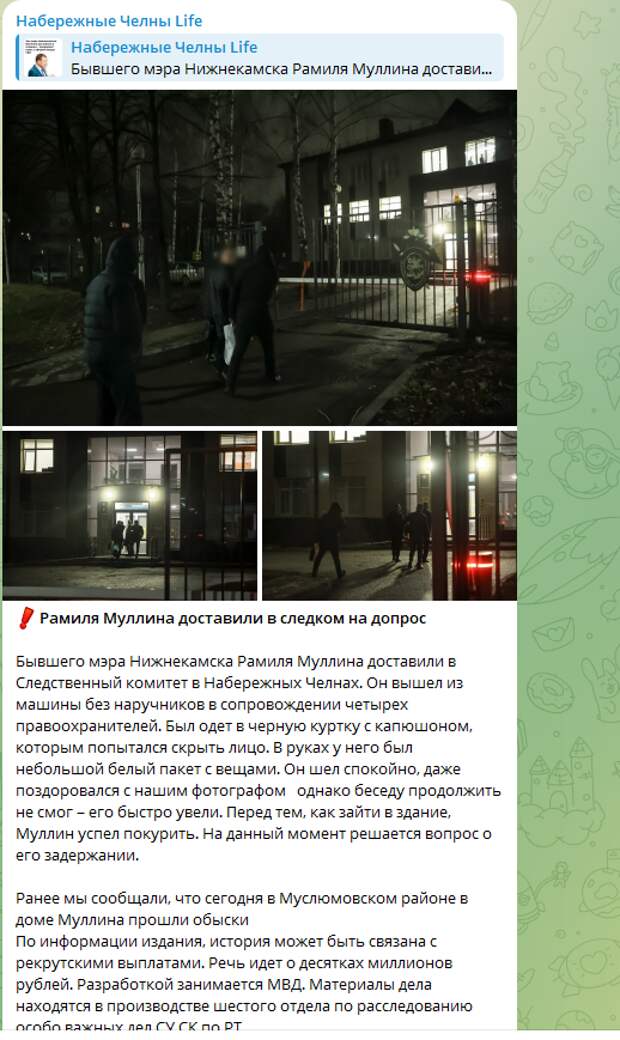 В местных СМИ рассказывают, что в Следственный Комитет в Набережных Челнах (город по соседству с Нижнекамском) Муллина привезли накануне вечером. До этого в его доме в Муслюмовском районе прошли обыски.